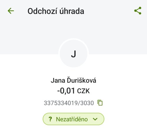 Poslat zprávupřidal/a skutečné jméno majitele účtu: Jana Ďurišková k bankovnímu účtu: 3375334019/3030