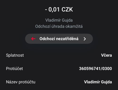 Poslat zprávupřidal/a skutečné jméno majitele účtu: Vladimír Gujda k bankovnímu účtu: 360596741/0300