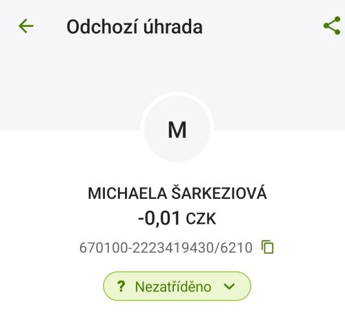 Poslat zprávupřidal/a skutečné jméno majitele účtu: Michaela Šarkeziová k bankovnímu účtu: 670100-2223419430/6210