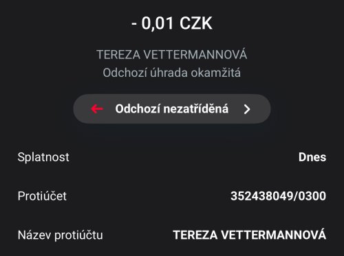 Poslat zprávupřidal/a skutečné jméno majitele účtu: Tereza Vettermannová k bankovnímu účtu: 352438049/0300