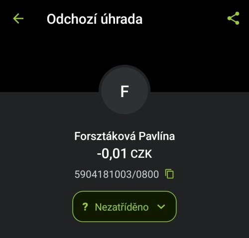 Poslat zprávupřidal/a skutečné jméno majitele účtu: Pavlína Forsztáková k bankovnímu účtu: 5904181003/0800