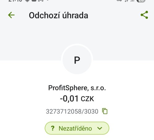 Poslat zprávupřidal/a skutečné jméno majitele účtu: ProfitSphere s.r.o. k bankovnímu účtu: 3273712058/3030