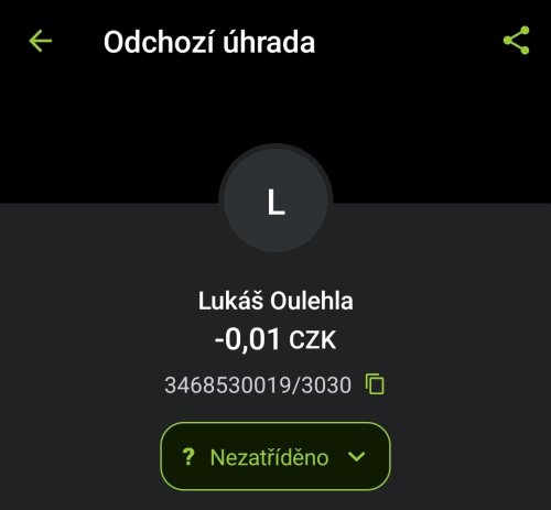 Poslat zprávupřidal/a skutečné jméno majitele účtu: Lukáš Oulehla k bankovnímu účtu: 3468530019/3030