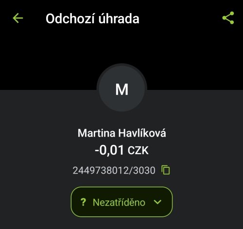Poslat zprávupřidal/a skutečné jméno majitele účtu: Martina Havlíková k bankovnímu účtu: 2449738012/3030