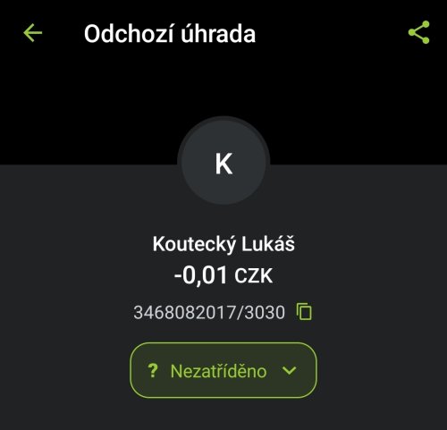 Poslat zprávupřidal/a skutečné jméno majitele účtu: Lukáš Koutecký k bankovnímu účtu: 3468082017/3030