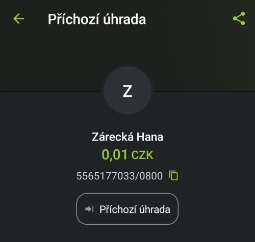 Poslat zprávupřidal/a skutečné jméno majitele účtu: Hana Zárecká k bankovnímu účtu: 5565177033/0800