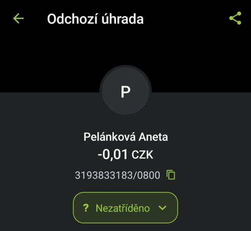 Poslat zprávupřidal/a skutečné jméno majitele účtu: Aneta Pelánková k bankovnímu účtu: 3193833183/0800