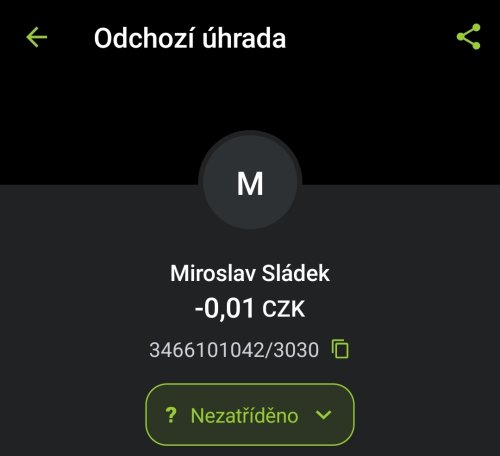 Poslat zprávupřidal/a skutečné jméno majitele účtu: Miroslav Sládek k bankovnímu účtu: 3466101042/3030