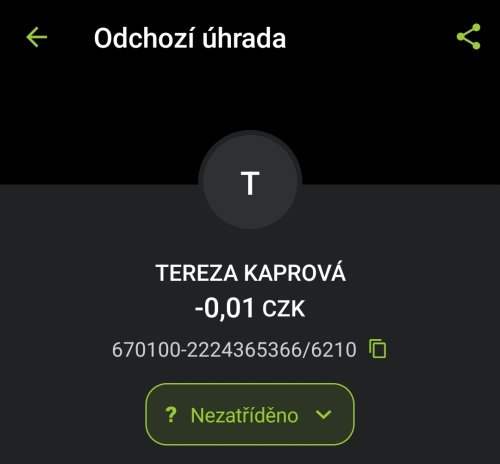 Poslat zprávupřidal/a skutečné jméno majitele účtu: Tereza Kaprová k bankovnímu účtu: 670100-2224365366/6210