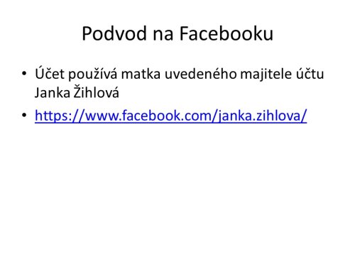 Poslat zprávuChtěla bych uvést na pravou míru můj případ - podvod na FB. Podařilo se mi dle jména kontaktovat majitele účtu. Majitelem je pán, který tento účet měl založený jako dítě a nepoužívá ho, používá jej jeho matka https://www.facebook.com/janka.zihlova/. Pan mi vše objasnil, matku kontaktoval. Nyní jme v kontaktu, budeme vše řešit navrácením peněz na můj účet. O dalším vývoji budu zde informovat.