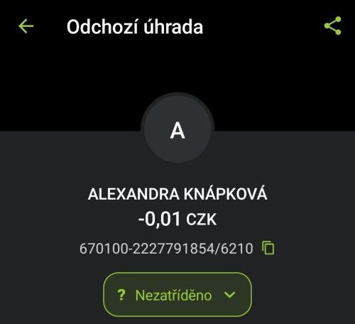 Poslat zprávupřidal/a skutečné jméno majitele účtu: Alexandra Knápková k bankovnímu účtu: 670100-2227791854/6210