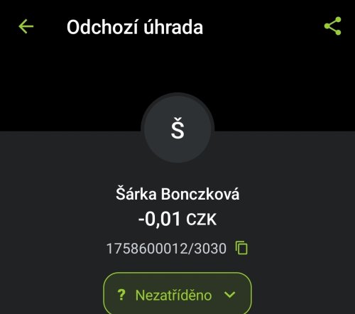 Poslat zprávupřidal/a skutečné jméno majitele účtu: Šárka Bonczková k bankovnímu účtu: 1758600012/3030