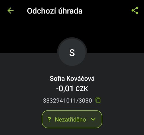 Poslat zprávupřidal/a skutečné jméno majitele účtu: Sofia Kováčová k bankovnímu účtu: 3332941011/3030