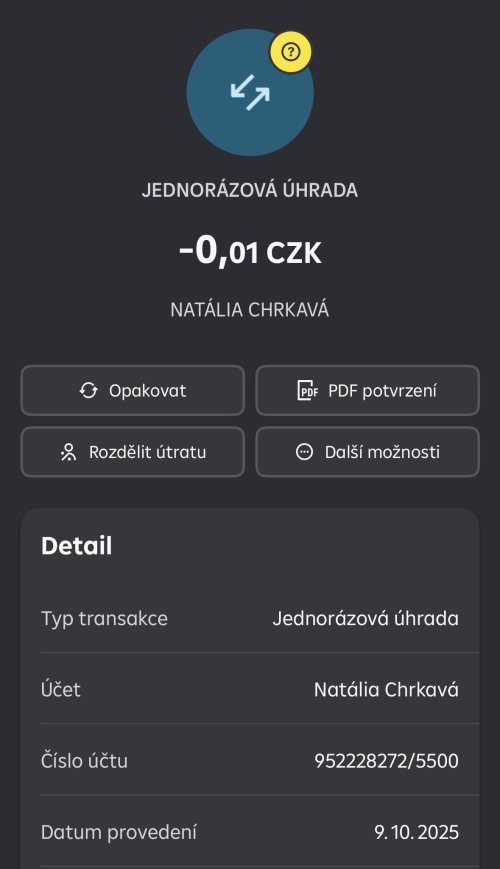 Poslat zprávupřidal/a skutečné jméno majitele účtu: Natália Chrkavá k bankovnímu účtu: 952228272/5500