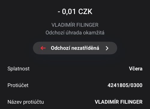 Poslat zprávupřidal/a skutečné jméno majitele účtu: Vladimír Filinger k bankovnímu účtu: 4241805/0300