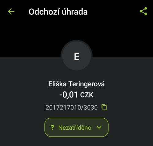 Poslat zprávupřidal/a skutečné jméno majitele účtu: Eliška Teringerová k bankovnímu účtu: 2017217010/3030