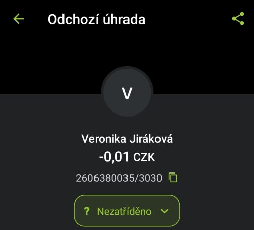 Poslat zprávupřidal/a skutečné jméno majitele účtu: Veronika Jiráková k bankovnímu účtu: 2606380035/3030