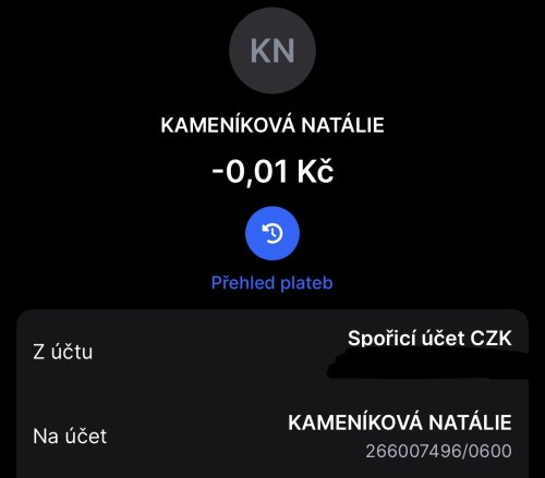 Poslat zprávupřidal/a skutečné jméno majitele účtu: Natálie Kameníková k bankovnímu účtu: 266007496/0600
