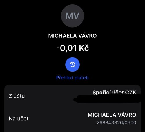 Poslat zprávupřidal/a skutečné jméno majitele účtu: Michaela Vávrová k bankovnímu účtu: 268843826/0600