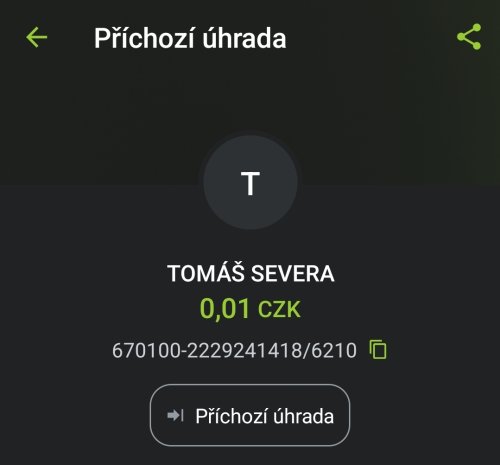 Poslat zprávupřidal/a skutečné jméno majitele účtu: Tomáš Severa k bankovnímu účtu: 670100-2229241418/6210