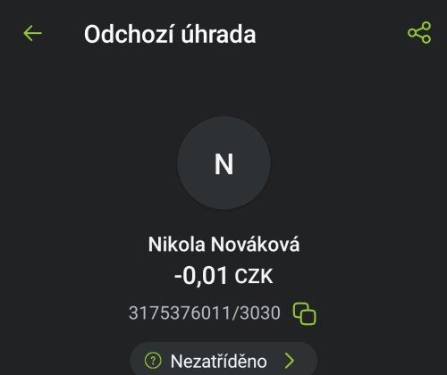 Poslat zprávupřidal/a skutečné jméno majitele účtu: Nikola Nováková k bankovnímu účtu: 3175376011/3030