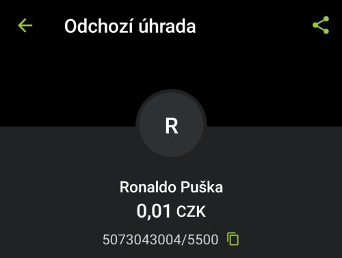 Poslat zprávupřidal/a skutečné jméno majitele účtu: Ronaldo Puška k bankovnímu účtu: 5073043004/5500