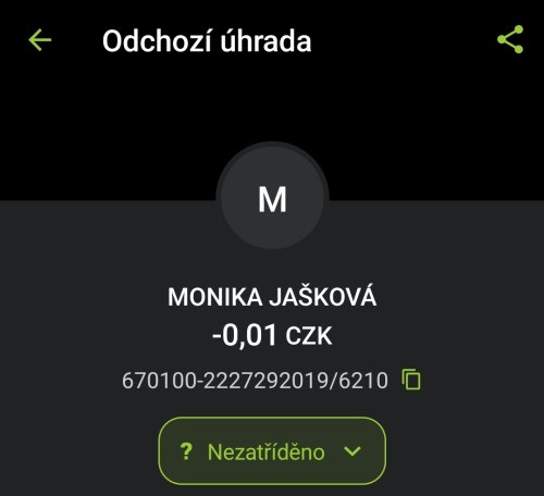 Poslat zprávupřidal/a skutečné jméno majitele účtu: Monika Jašková k bankovnímu účtu: 670100-2227292019/6210