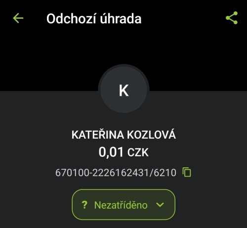 Poslat zprávupřidal/a skutečné jméno majitele účtu: Kateřina Kozlová k bankovnímu účtu: 670100-2226162431/6210