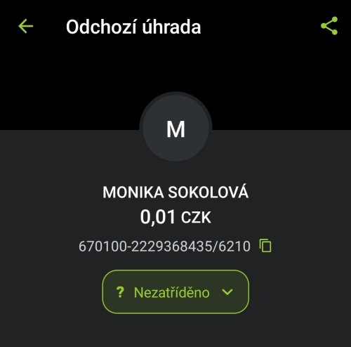 Poslat zprávupřidal/a skutečné jméno majitele účtu: Monika Sokolová k bankovnímu účtu: 670100-2229368435/6210