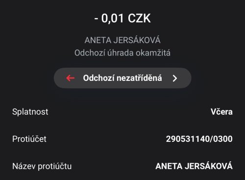 Poslat zprávupřidal/a skutečné jméno majitele účtu: Aneta Jersáková k bankovnímu účtu: 290531140/0300