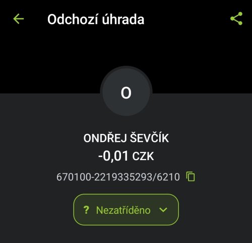 Poslat zprávupřidal/a skutečné jméno majitele účtu: Ondřej Ševčík k bankovnímu účtu: 670100-2219335293/6210