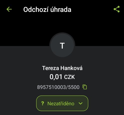 Poslat zprávupřidal/a skutečné jméno majitele účtu: Tereza Hanková k bankovnímu účtu: 8957510003/5500
