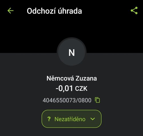 Poslat zprávupřidal/a skutečné jméno majitele účtu: Zuzana Němcová k bankovnímu účtu: 4046550073/0800