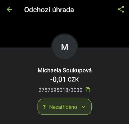 Poslat zprávupřidal/a skutečné jméno majitele účtu: Michaela Soukupová k bankovnímu účtu: 2757695018/3030