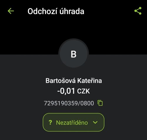 Poslat zprávupřidal/a skutečné jméno majitele účtu: Kateřina Bartošová k bankovnímu účtu: 7295190359/0800