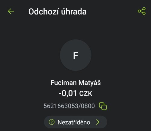 Poslat zprávupřidal/a skutečné jméno majitele účtu: Matyáš Fucian k bankovnímu účtu: 5621663053/0800