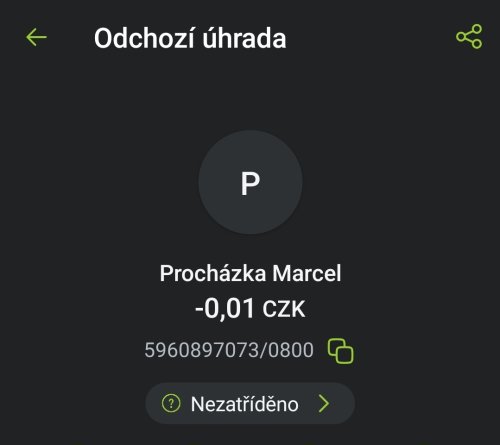 Poslat zprávupřidal/a skutečné jméno majitele účtu: Marcel Procházka k bankovnímu účtu: 5960897073/0800