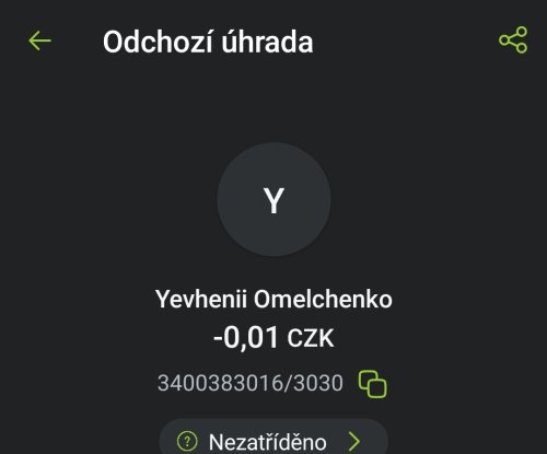 Poslat zprávupřidal/a skutečné jméno majitele účtu: Yevhenii Omelchenko k bankovnímu účtu: 3400383016/3030