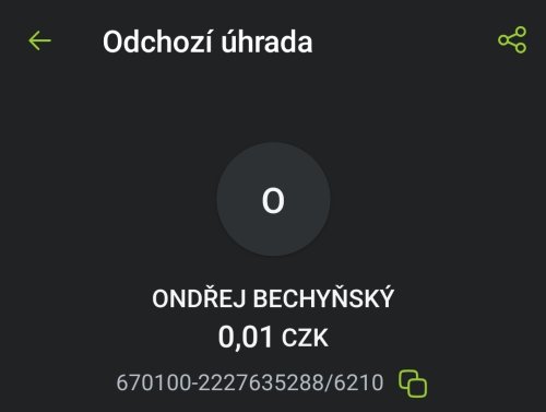 Poslat zprávupřidal/a skutečné jméno majitele účtu: Ondřej Bechyňský k bankovnímu účtu: 670100-2227635288/6210