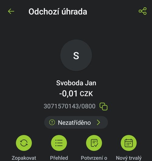 Poslat zprávupřidal/a skutečné jméno majitele účtu: Jan Svoboda k bankovnímu účtu: 3071570143/0800