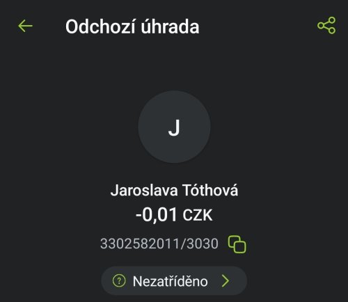 Poslat zprávupřidal/a skutečné jméno majitele účtu: Jaroslava Tóthová k bankovnímu účtu: 3302582011/3030