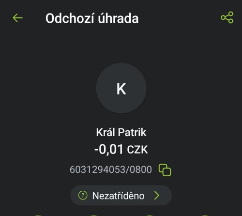 Poslat zprávupřidal/a skutečné jméno majitele účtu: Patrik Král k bankovnímu účtu: 6031294053/0800