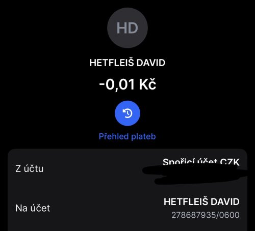 Poslat zprávupřidal/a skutečné jméno majitele účtu: David Hetfleiš k bankovnímu účtu: 278687935/0600