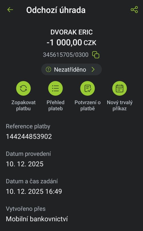 Poslat zprávupřidal/a skutečné jméno majitele účtu: Eric Dvořák k bankovnímu účtu: 345615705/0300