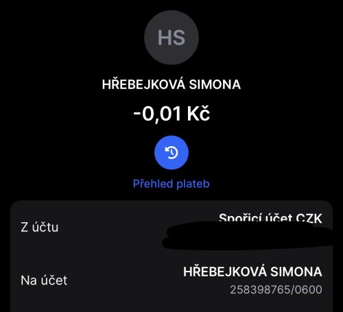 Poslat zprávupřidal/a skutečné jméno majitele účtu: Simona Hřebejková k bankovnímu účtu: 258398765/0600