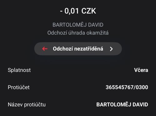 Poslat zprávupřidal/a skutečné jméno majitele účtu: Bartoloměj David k bankovnímu účtu: 365545767/0300