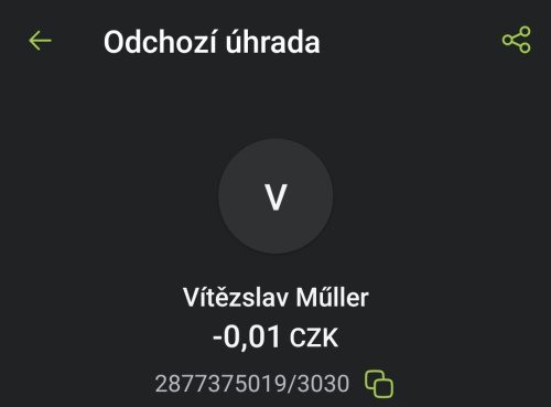 Poslat zprávupřidal/a skutečné jméno majitele účtu: Vítězslav Műller k bankovnímu účtu: 2877375019/3030