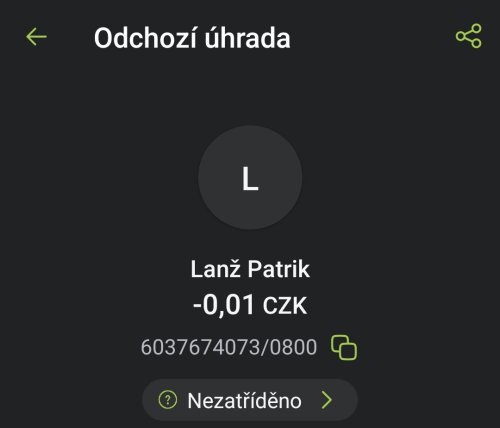 Poslat zprávupřidal/a skutečné jméno majitele účtu: Patrik Lanž k bankovnímu účtu: 6037674073/0800