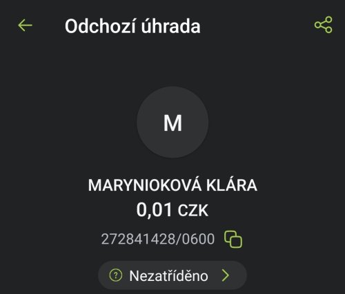 Poslat zprávupřidal/a skutečné jméno majitele účtu: Marynioková Klára k bankovnímu účtu: 272841428/0600