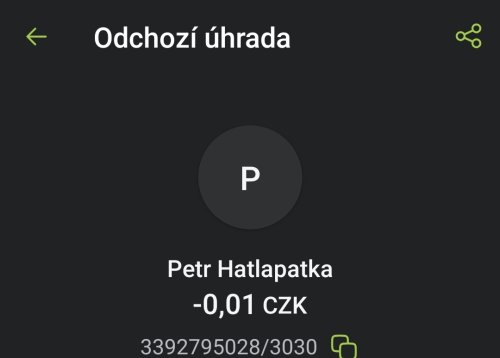 Poslat zprávupřidal/a skutečné jméno majitele účtu: Petr Hatlapatka k bankovnímu účtu: 3392795028/3030